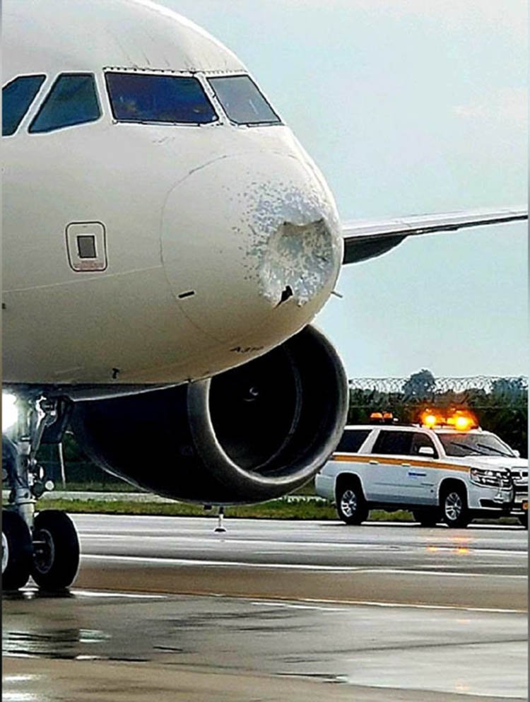 Delta Havayollarına ait Airbus A319 tip yolcu uçağı olumsuz hava şartlarının kurbanı oldu. Dolu uçağa zarar verdi.